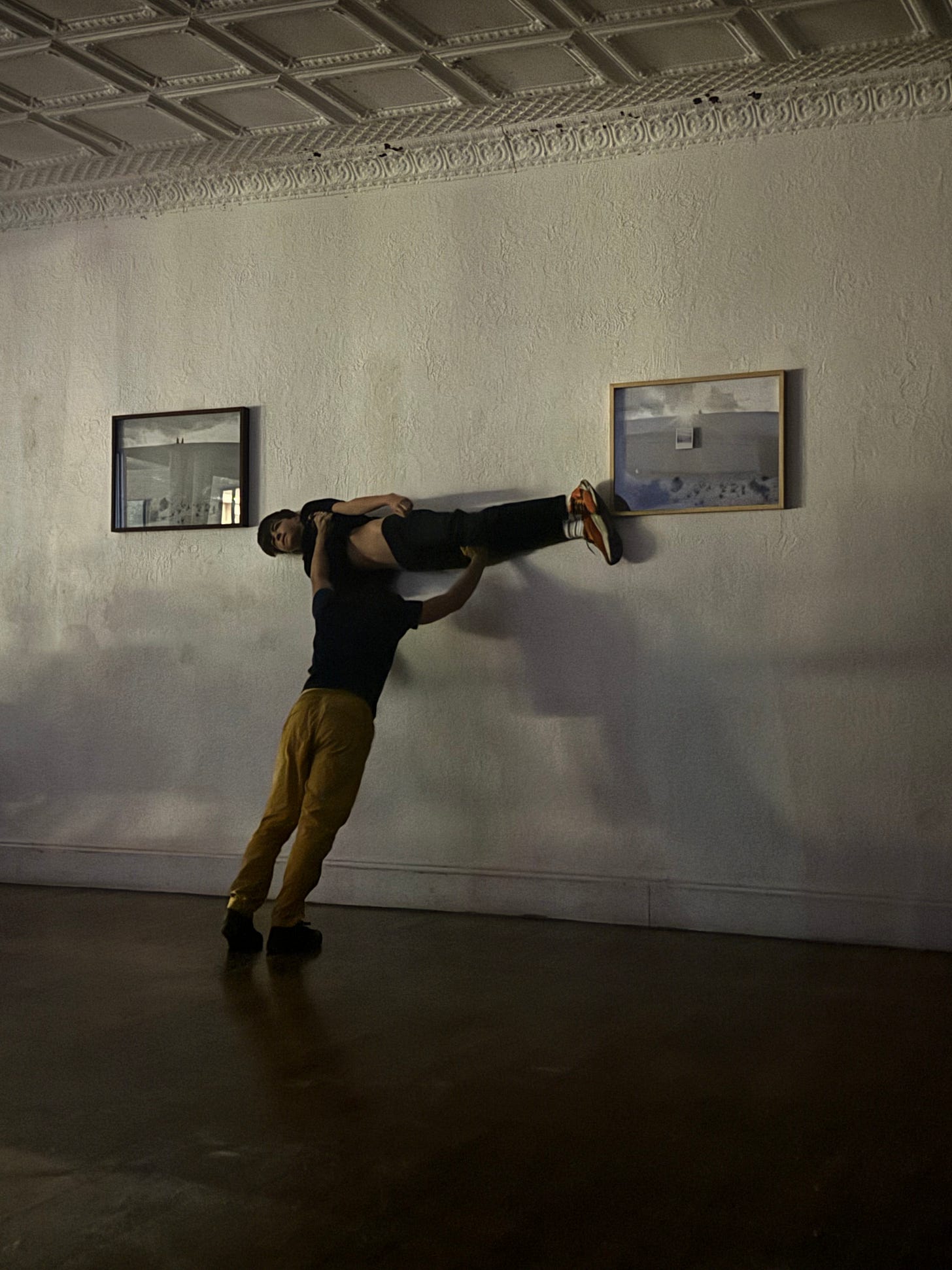 Unlike ballerinas or Broadway dancers, who are trained to never let anyone see sweat (even in hula, dancers are taught to plaster on a smile even if the apocalypse is going on around them) Davis’ effort shows in every chaotic grapevine racing towards his stepson. The most physically exerting feat of display involves Davis suspended mid-air as his chalky palms grip a metal bar as Cooper Grosshardt meanders the space below. When Cooper Grosshardt’s head ventures too close to Davis’ feet, Davis contorts himself to accommodate his son.